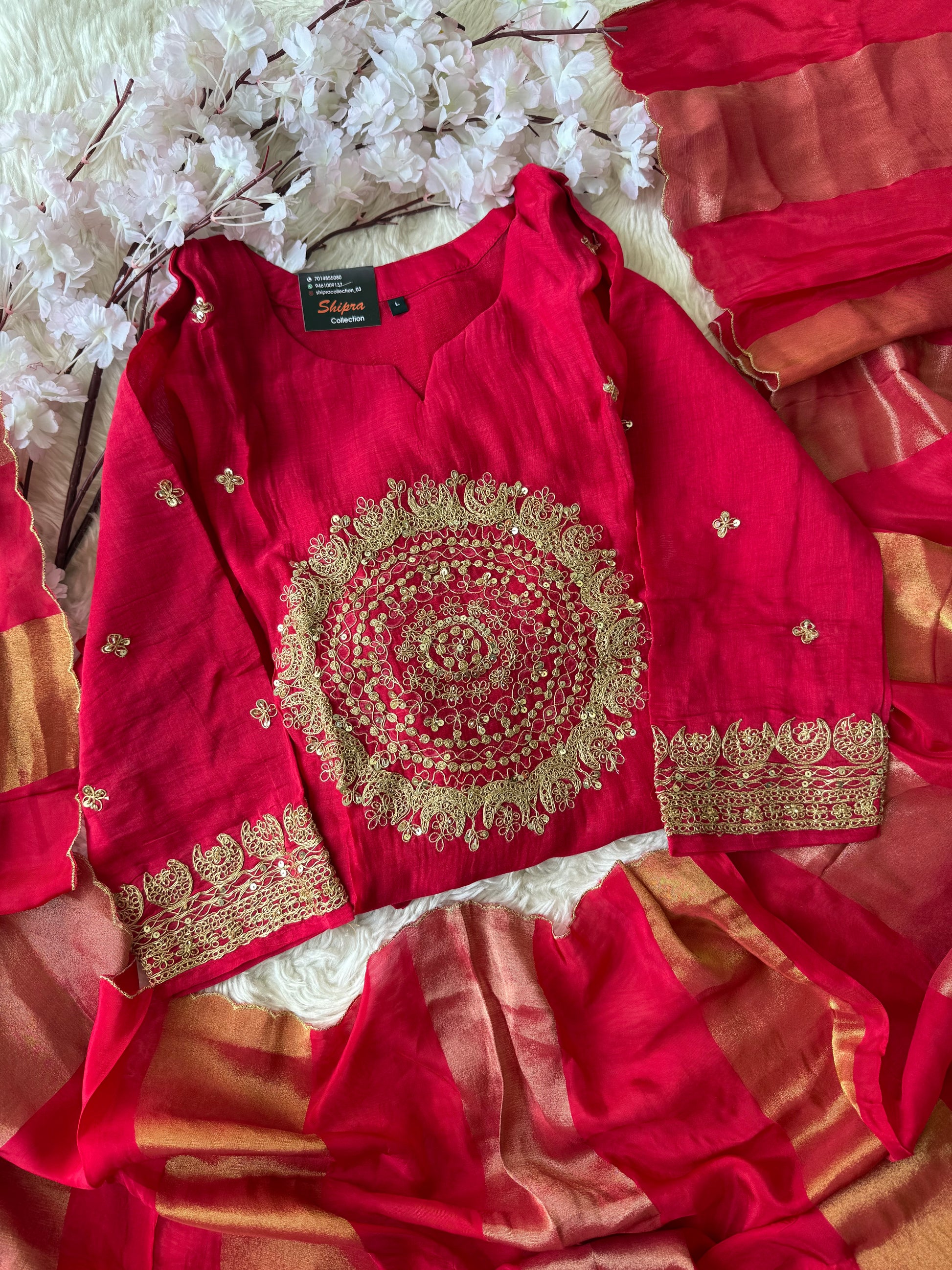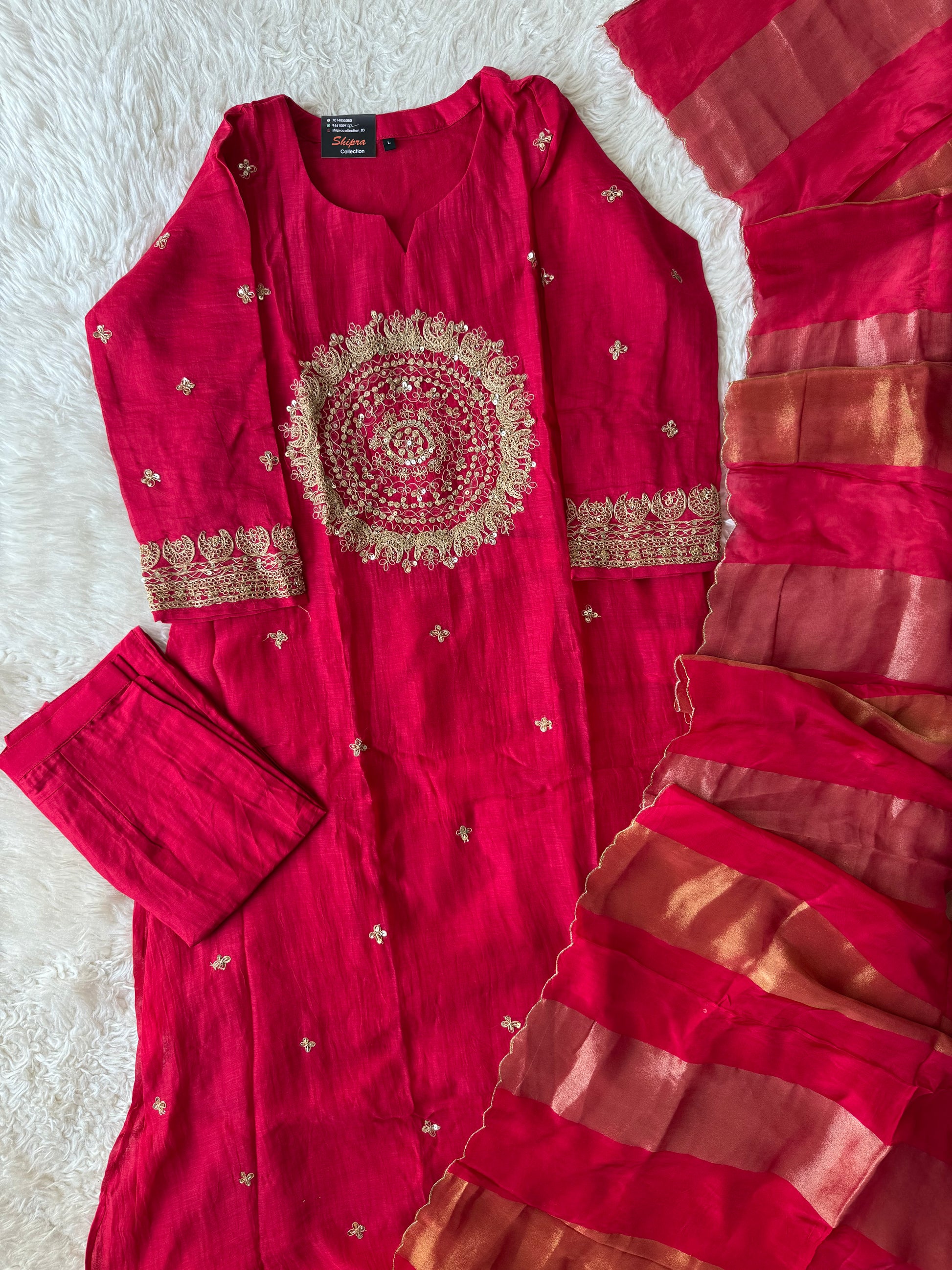 Pure Mul Chanderi Kurti Pant Dupatta Set